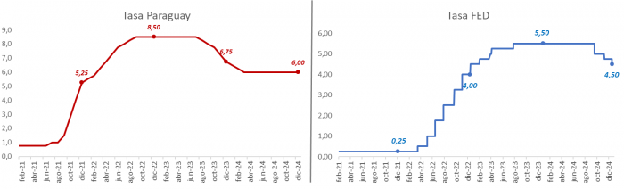 Tasa de política monetaria en Paraguay y Estados Unidos (%)