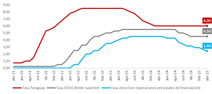 Evolución mensual de la tasa de política monetaria en Paraguay, Estados Unidos y Zona Euro